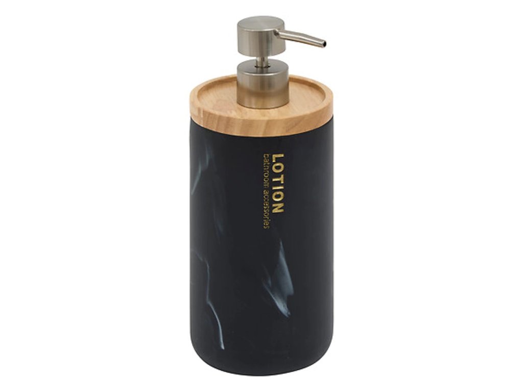 Dávkovač mydla Lotion s objemom až 842 ml je vyrobený z odolnej zmesi polyresinu, ktorá mu dodáva elegantný čierny vzhľad so zaujímavým mramorovým efektom. Kombinácia čierneho povrchu a bambusového veka pôsobí štýlovo a zároveň príjemne prirodzene.