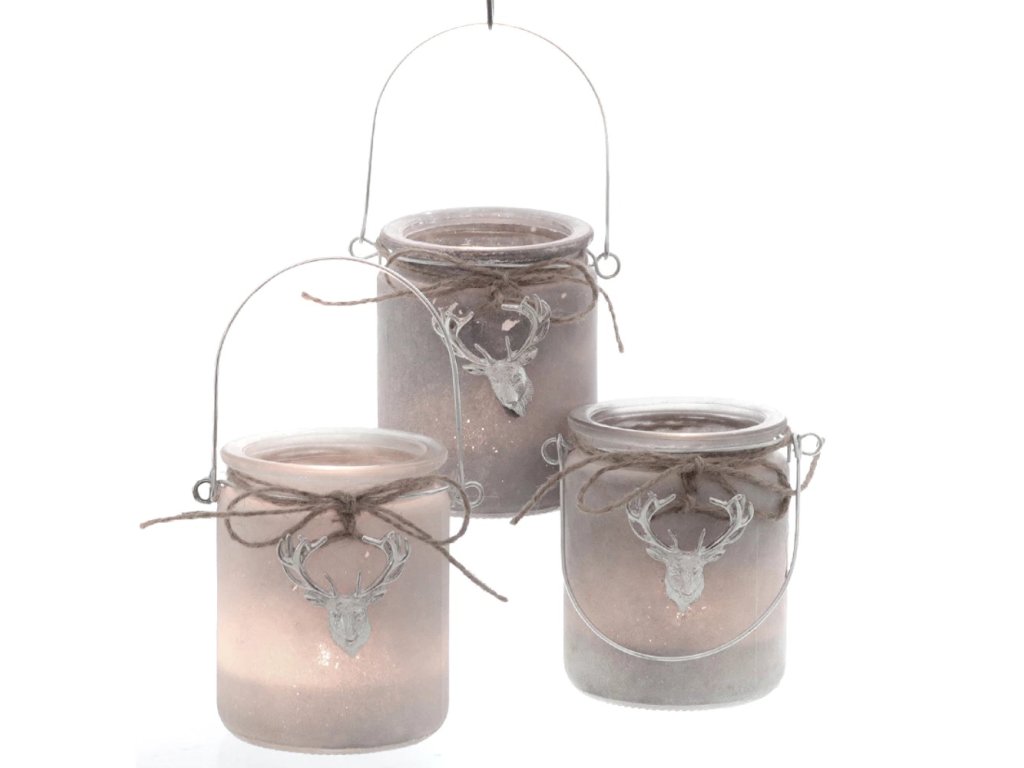 Sklenený svietnik na čajovú sviečku D8V10cm s hlavou jeleňa a rúčkou - sivá.